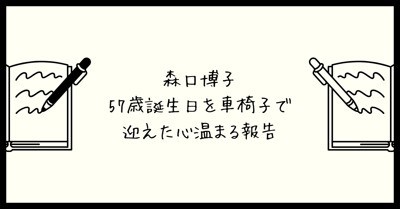 そんな森口さんですが、5月20日に出演したライブで、登場時に階段でつまずき左足首を剥離骨折するというアクシデントに見舞われました。その後、車椅子での生活を余儀なくされる中、6月13日に57歳の誕生日を迎えたことを報告。ラジオ番組「KISS&SMILE」の生放送後、スタッフからは彼女の故郷・福岡の甘酒や、カルシウムが豊富なビスコなど、骨折を気遣ったプレゼントが贈られ、森口さんは感謝の気持ちを綴っています。