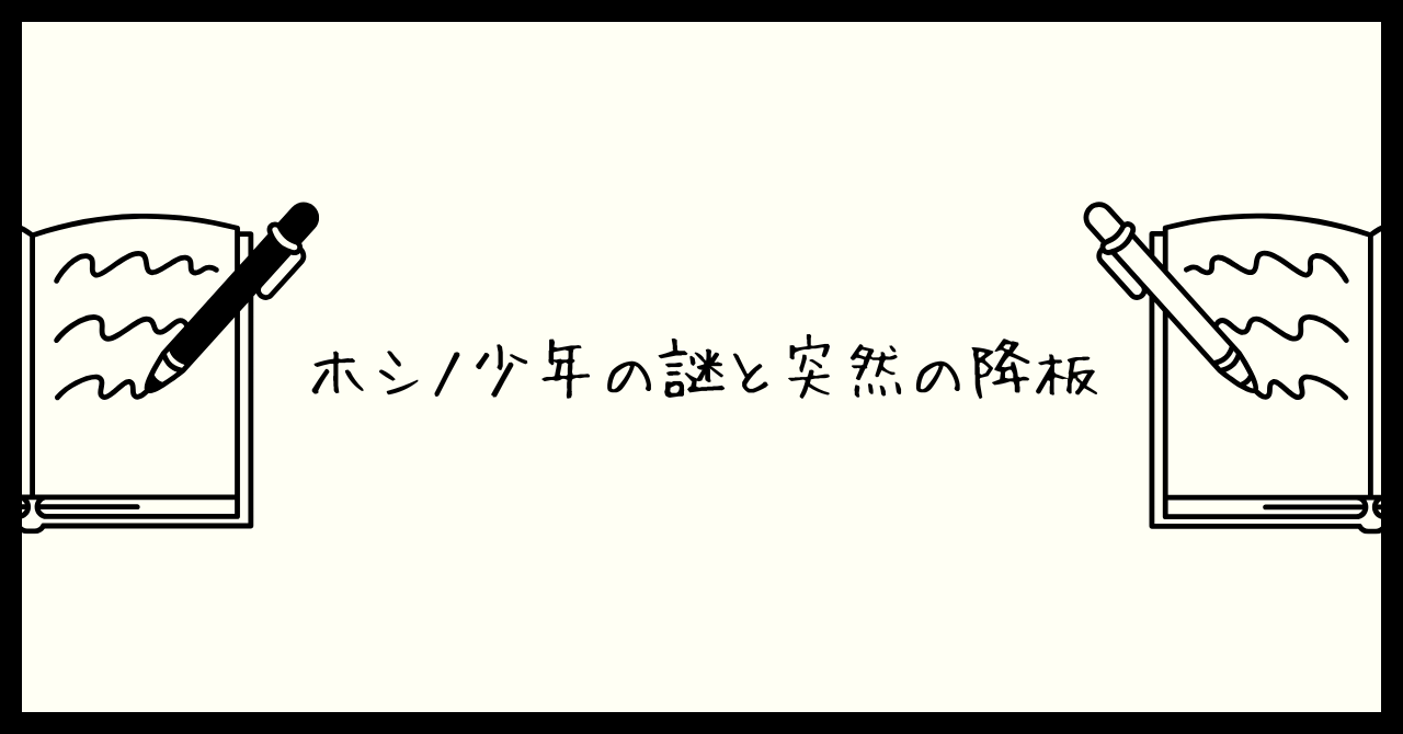 しかし、第25話以降、ホシノ少年は突如として番組から姿を消してしまいます1。この突然の消失について、当時から様々な憶測が飛び交いました。病気や失踪、事故、あるいは同年代の少年たちの嫉妬の声が酷かったためクビになったなど、多くのうわさが広がりました1。